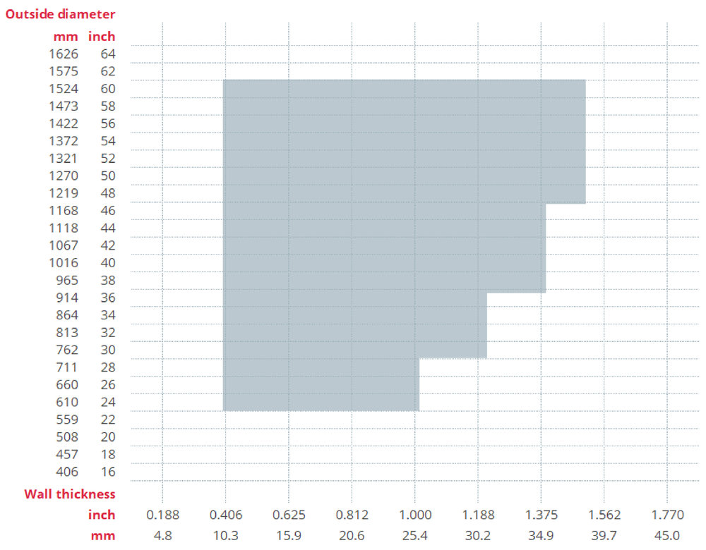 610 mm - 1524 mm 10,3 mm – 38.0 mm Up to 24 mt. (double jointing)
